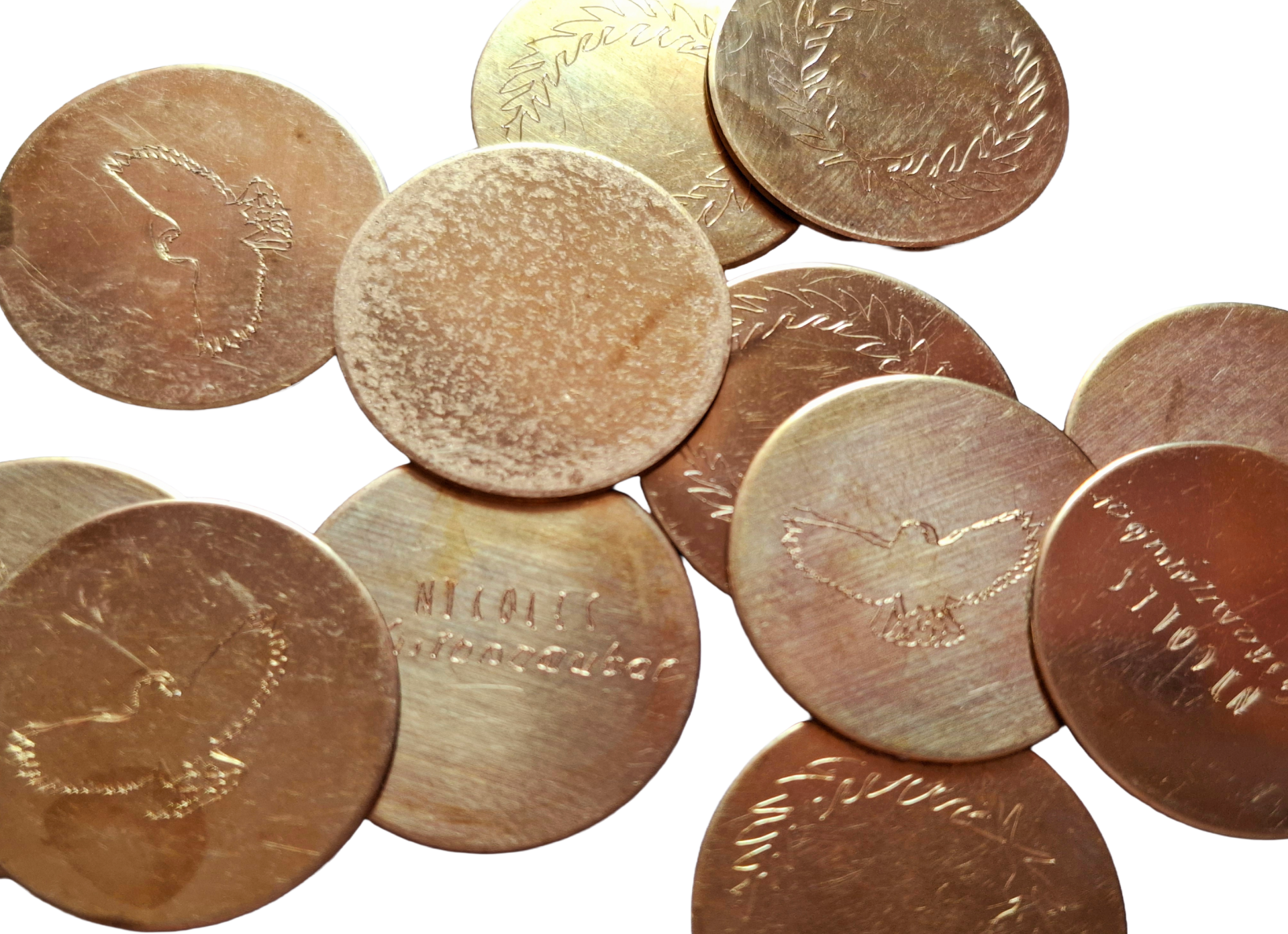 15 gravierte Messingmünzen – mit Heeresadler oder Siegeskranz, als Belohnung und Erinnerungsstück
