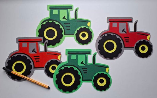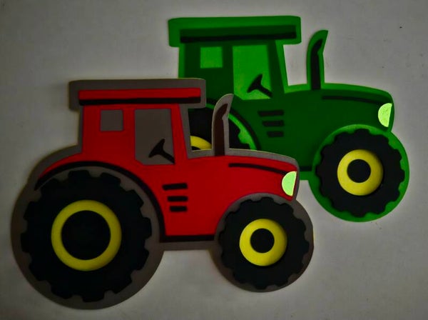 - 4 Traktoreinladungen mit im Dunkeln leuchtenden Scheinwerfern, mit passendem Fineliner