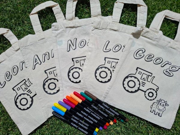 - 5 Taschen zum Bemalen, personalisiert mit den Namen der Gäste