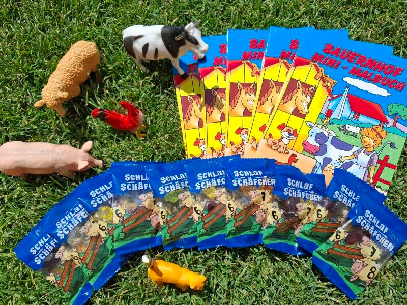 Hast du das Zeug zum waschechten Bauer? - 5 Gastgeschenke mit Tierfiguren, Malbüchern und Schäfchen-Fruchtgummis