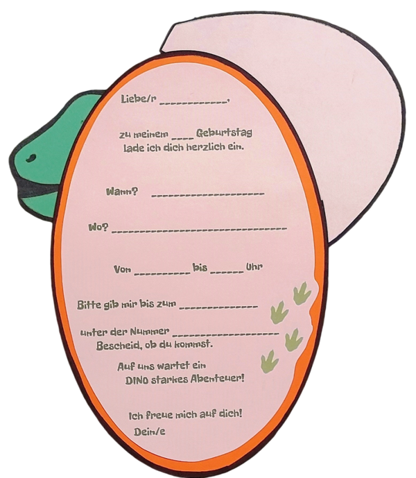 Liebevoll in Dino-Optik gestaltet – mit Augen und Zähnen, die im Dunkeln leuchten. Einfach ausfüllen und direkt starten. In unseren Einladungs-Sets inklusive passendem Fineliner.