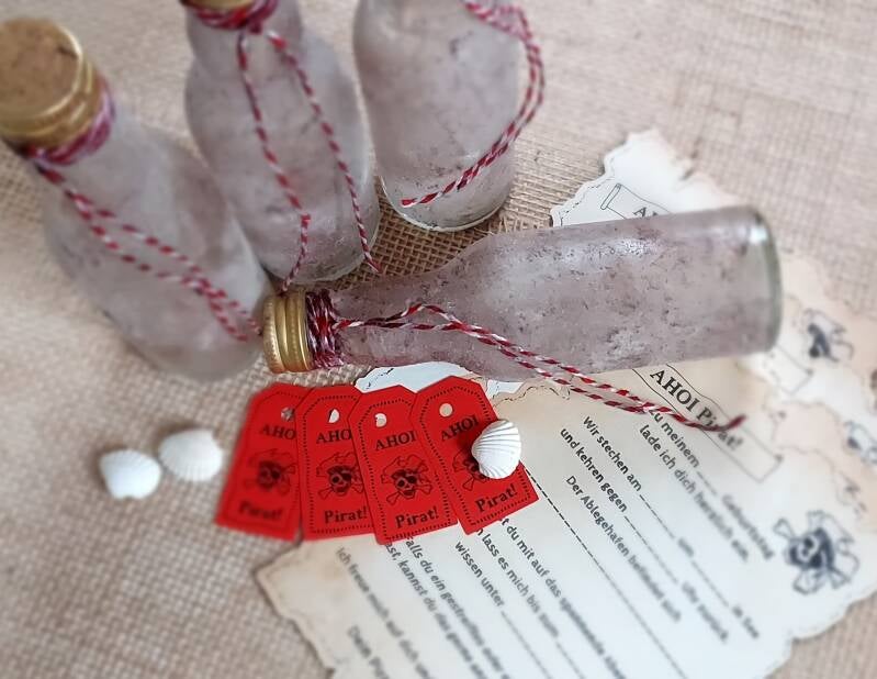 - Flaschenanhänger als Namensschilder mit selbst entworfenem Design mit Pirat Elmar